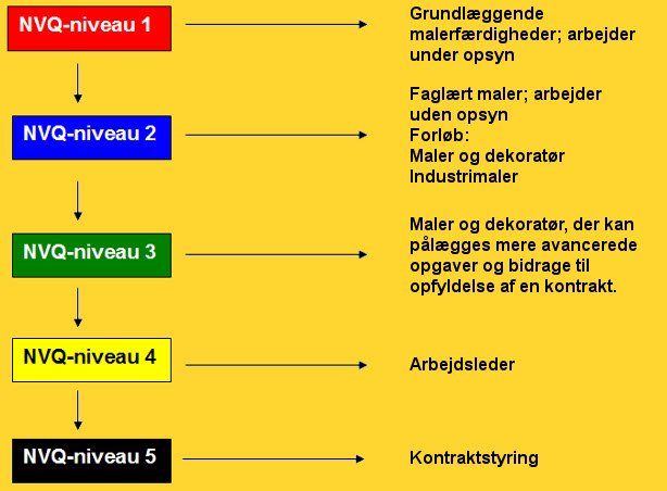 - NVQ-niveau 4 og 5 omhandler ledelse og indbefatter ikke praktiske maler- og dekoratørfærdigheder.